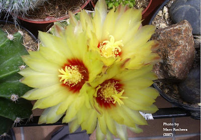 Thelocactus setispinus fiel como cada año regala desde hace mas de un mes flores amarillas, tres al mismo tiempo es el